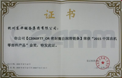 會(huì)上,與會(huì)人員主要圍繞會(huì)議主題進(jìn)行技術(shù)、市場(chǎng)、創(chuàng)新、發(fā)展等廣泛交流。會(huì)議期間,評(píng)比并頒發(fā)了2015中國(guó)農(nóng)機(jī)零部件46項(xiàng)金獎(jiǎng)產(chǎn)品和25項(xiàng)創(chuàng)新獎(jiǎng)產(chǎn)品。東華申報(bào)的C2060F77_OR和C2062H_ORSDF1密封圈鏈條經(jīng)久保田、福田雷沃等知名整機(jī)企業(yè)的推薦,專(zhuān)家委員會(huì)最終評(píng)審決定,對(duì) 東華申報(bào)的這兩款密封圈鏈條分別授予金獎(jiǎng)和創(chuàng)新獎(jiǎng)。這個(gè)獎(jiǎng)項(xiàng)是目前農(nóng)機(jī)鏈條企業(yè)的最高榮譽(yù),體現(xiàn)了東華農(nóng)機(jī)鏈條處于國(guó)內(nèi)同行領(lǐng)先水平,得到廣大農(nóng)業(yè)主機(jī)單位的贊譽(yù)和認(rèn)可。東華生產(chǎn)的農(nóng)機(jī)鏈條也暢銷(xiāo)國(guó)際市場(chǎng),與CLASS、紐荷蘭等世界500強(qiáng)企業(yè)配套。