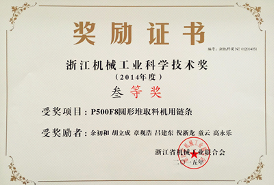 4月23日,浙江省機(jī)械工業(yè)聯(lián)合會四屆二次理事(擴(kuò)大)會議暨2014年度科學(xué)技術(shù)獎頒獎大會在杭州召開。會上,浙江機(jī)械工業(yè)聯(lián)合會表彰了52項“2014年度浙江機(jī)械工業(yè)科學(xué)技術(shù)獎”獎勵項目。由東華集團(tuán)技術(shù)中心組織申報、集團(tuán)所屬杭州自強(qiáng)鏈傳動有限公司工程鏈?zhǔn)聵I(yè)部為主研發(fā)的“P500F8圓形堆取料機(jī)用鏈條”高端產(chǎn)品項目榮獲三等獎,這是東華集團(tuán)的產(chǎn)品創(chuàng)新項目連續(xù)三年榮獲浙江省機(jī)械工業(yè)科學(xué)技術(shù)獎,也是2014年度全省諸多機(jī)械產(chǎn)品中唯一一項鏈傳動產(chǎn)品開發(fā)項目獲獎。
