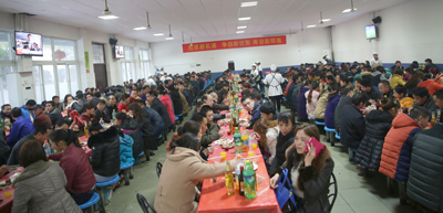 2月16日晚上,集團(tuán)公司南區(qū)、北區(qū)食堂里張燈結(jié)彩,拉滿喜慶橫幅,600多名外地留守員工沉浸在喜迎新春的歡樂氛圍中。公司正在為今年沒有回老家過春節(jié)的外地留守員工舉行“同吃年夜飯,歡度春節(jié)”活動。