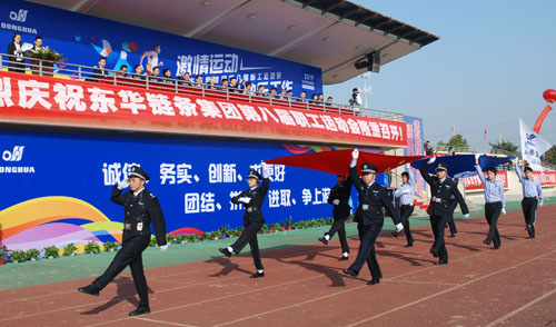 開幕式上,隨著高亢激昂的運(yùn)動(dòng)員進(jìn)行曲響起,國(guó)旗隊(duì)、廠旗隊(duì)、舞蹈隊(duì)、東華黨群服務(wù)驛站代表隊(duì)、各分工會(huì)代表隊(duì)等共19支方隊(duì)有序入場(chǎng)。各代表隊(duì)員工精神飽滿,口號(hào)響亮,步伐整齊,展示出東華員工朝氣蓬勃的精神風(fēng)貌。