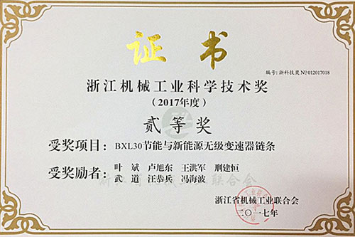 又訊:日前,公司生產(chǎn)的BXL30節(jié)能與新能源無級變速器鏈條被浙江省機(jī)械工業(yè)聯(lián)合會評為“浙江機(jī)械工業(yè)科學(xué)技術(shù)獎貳等獎”。