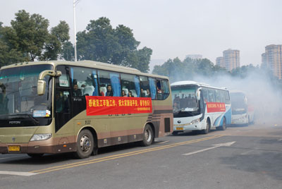 1月25日中午,公司南廠區(qū)大門外分外熱鬧,9部掛著祝福員工一路平安、新年快樂橫幅的大巴車一字排列,等待著送300余名員工回家過春節(jié),濃濃的節(jié)日氛圍掛在每個員工的臉上。