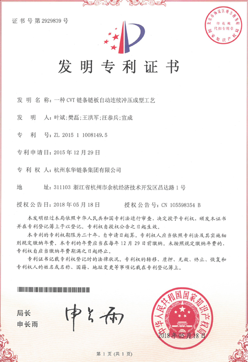 另,2019年12月,集團知識產(chǎn)權管理體系順利通過中知(北京)認證有限公司的年度監(jiān)督審核,進一步證實了集團公司知識產(chǎn)權管理體系運行有效性。同時,《2019年度浙江省專利項目績效評價(專利獎)結(jié)果公示》,集團公司“一種CVT鏈條鏈板自動連續(xù)沖壓成型工藝”發(fā)明專利榮獲浙江省專利優(yōu)秀獎。