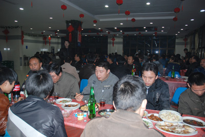 2月6日晚上,東華集團(tuán)南區(qū)、新區(qū)的食堂里張燈結(jié)彩,一片歡聲笑語(yǔ),550多名外地留守員工正沉浸在喜迎新春的歡樂(lè)氛圍中,這里正在為外地留守員工舉行“同吃年夜飯,歡度除夕夜”活動(dòng)。