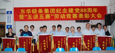 會上,總經(jīng)理張世強作了重要講話。張總說,在“七一”即將來臨之際,我們召開“紀念中國共產(chǎn)黨成立88周年暨五講五賽勞動競賽表彰大會”。首先,我代表集團領(lǐng)導(dǎo)、黨委向受表彰的先進集體和先進個人表示熱烈地祝賀,向他們表示崇高的敬意!號召全體黨員、全廠職工認真學(xué)習(xí)他們的先進事跡和崇高精神,立足崗位、艱苦奮斗,在生產(chǎn)勞動中為企業(yè)建功立業(yè),在推動?xùn)|華集團持續(xù)發(fā)展中做出更大的貢獻。