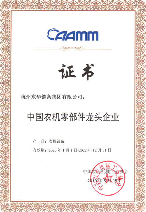 中國農(nóng)機(jī)工業(yè)協(xié)會(huì)從2013年開始,每三年一次組織眾多農(nóng)機(jī)行業(yè)的知名專家,根據(jù)企業(yè)的生產(chǎn)經(jīng)營規(guī)模、市場占有率、品牌影響力等要素,評選出具有行業(yè)代表性的優(yōu)秀龍頭企業(yè)。東華鏈條分別于2013年、2016年、2019年連續(xù)三屆被授予“中國農(nóng)機(jī)零部件龍頭企業(yè)”稱號,該殊榮是中國農(nóng)機(jī)工業(yè)協(xié)會(huì)打造的行業(yè)品牌榮譽(yù),也是中國農(nóng)機(jī)零部件企業(yè)的金名片。