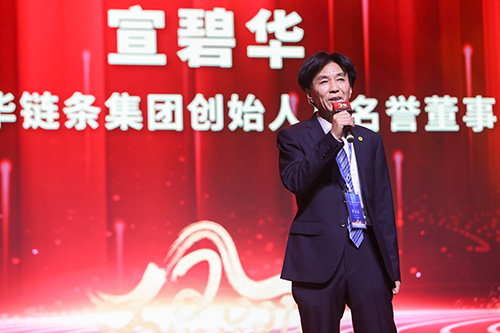 “鏈動世界”的開場舞后,集團創(chuàng)始人、名譽董事長宣碧華致辭。他說,東華三十年來從小做到大,產品從少做到多,從中國做到全球,從專注做到專業(yè),從耐心做成迷戀。三十年來得到員工的擁護,用戶的認可,同行的尊重。三十年中,我們穩(wěn)健經營,專注制造業(yè),為了預防風險,東華三十年中消化了冷落,扛住了壓力,遵守誠信,擔當責任,創(chuàng)造價值。常言道十年磨一劍。東華三十年磨三把劍,誠信、責任、價值。今天東華還在路上,還要繼續(xù)擔當下去。感謝各位多年來對東華的支持,也感謝今天沒有來參加這次慶典大會的東華員工以及上下游產業(yè)鏈的朋友,祝大家身體健康、事業(yè)有成、家庭幸福。