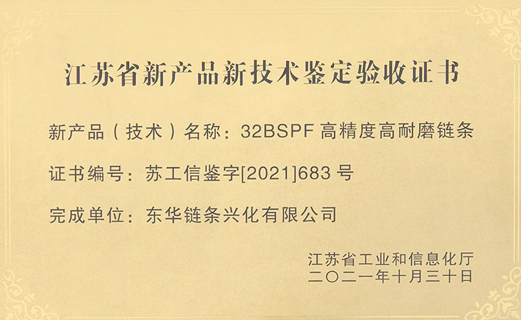 日前, 東華鏈條興化公司收到江蘇省工業(yè)和信息化廳頒發(fā)的江蘇省省級工業(yè)新產(chǎn)品新技術(shù)驗收證書,公司研制的“32BSPF高精度高耐磨鏈條”產(chǎn)品通過省級工業(yè)新產(chǎn)品鑒定。
